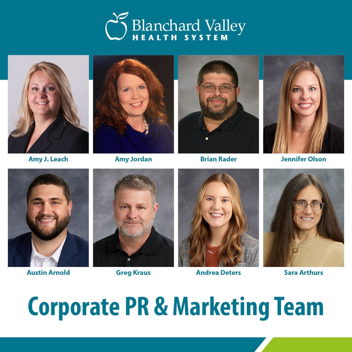 The Corporate PR & Marketing team at BVHS consists of Amy J. Leach, director; Amy Jordan, graphics coordinator; Brian Rader, print shop coordinator; Jennifer Olson, corporate event planner; Austin Arnold, internal communications coordinator; Greg Kraus, video production coordinator; Andrea Deters, social media coordinator; and Sara Arthurs, external communications coordinator.