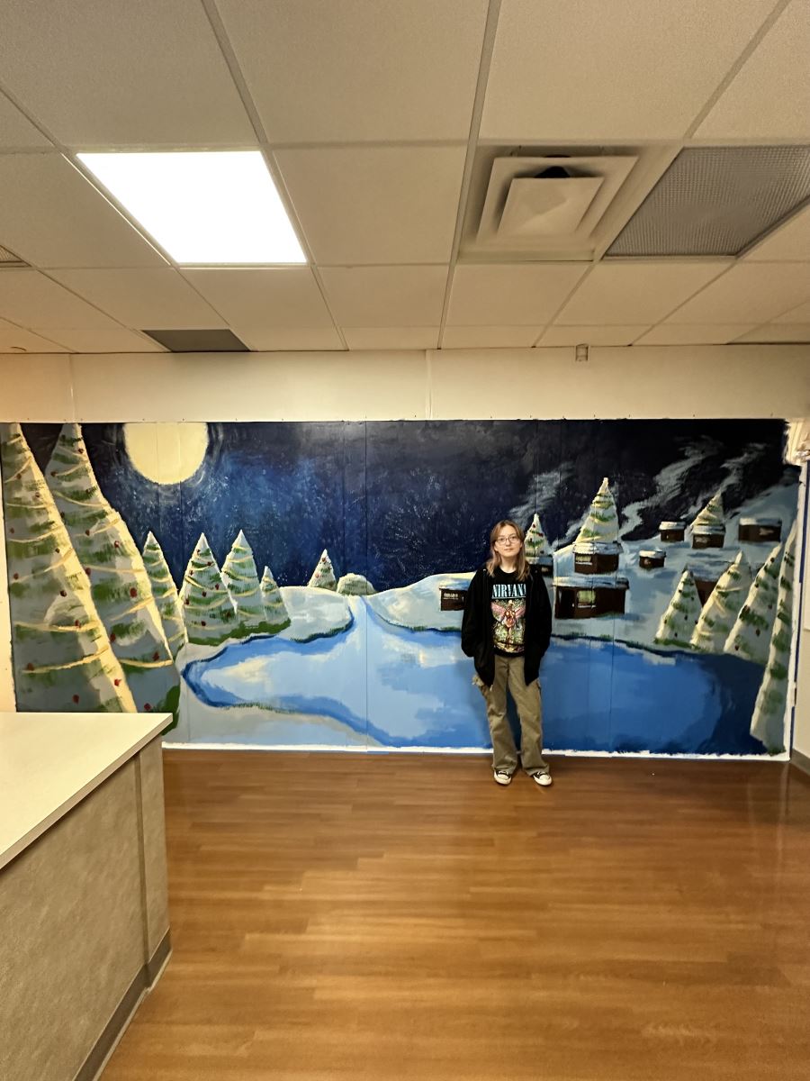 Sheets acted as the liaison. Since the wall would be up for a significant portion of winter, they settled on a winter scene. Zoie came up with an image of mountains and trees amid the snow.